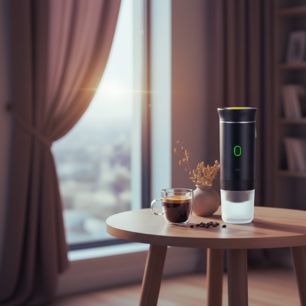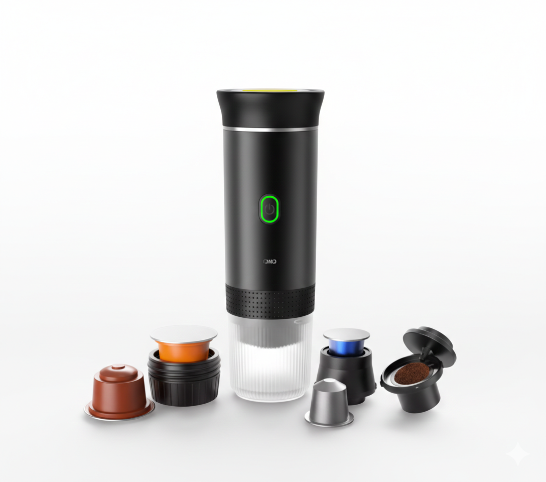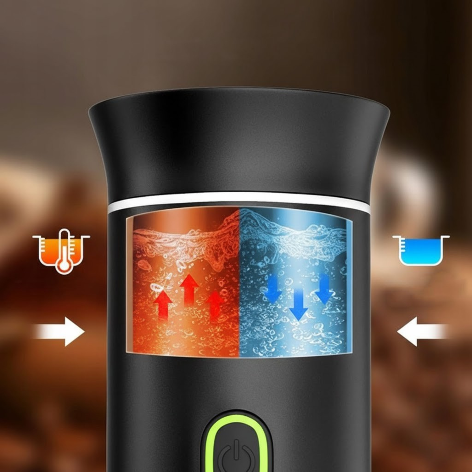 Wbudowany akumulator i system samonagrzewania pozwalają na przygotowanie gorącej kawy nawet z zimnej wody w kilka minut.